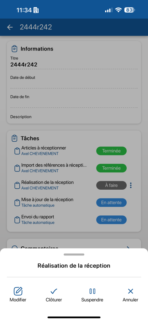 3. Sur la tâche, Réalisation de la réception, cliquer sur l’icône