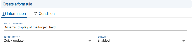 6. Go to Informationfill in the information required to create your new form rule: Creating a form rule 7. In the Conditions tab section Conditions tab, fill in the information needed to define the criteria for applying the form rule: 8. Go to Actions to be carried out, section, enter the actions to be taken if the criteria defined in the Conditions section are validated: 9. To check that the form rule has been correctly applied, click on Quick updateto select a folder and the appropriate form.