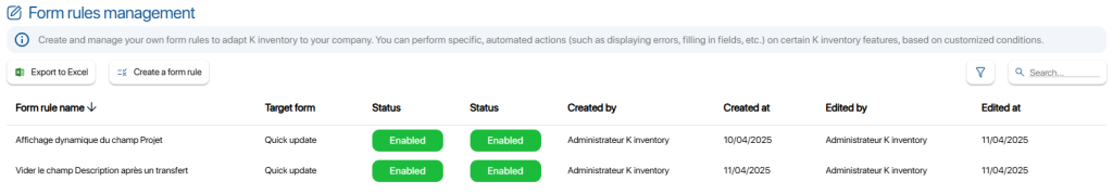 Form Rules management enables users to define specific, automated behaviors within K Inventory forms, offering adaptability for each company’s business processes.