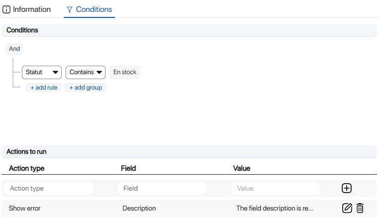 6. Go to Information fill in the information required to create your new form rule: Creating a form rule 7. In the Conditions tab section Conditions tab, fill in the information needed to define the criteria for applying the form rule: 8. Go to Actions to be carried out, section, enter the actions to be taken if the criteria defined in the Conditions section are validated: 9. To check that the form rule has been correctly applied, click on Quick update to select a folder and the appropriate form. Result of error message display on Description field To continue browsing, here are a few articles related to this page: