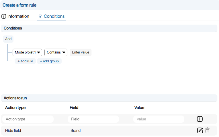 6. Go to Informationfill in the information required to create your new form rule: Creating a form rule 7. In the Conditions tab section Conditions tab, fill in the information needed to define the criteria for applying the form rule: 8. Go to Actions to be carried out, section, enter the actions to be taken if the criteria defined in the Conditions section are validated: 9. To check that the form rule has been correctly applied, click on Quick updateto select a folder and the appropriate form.